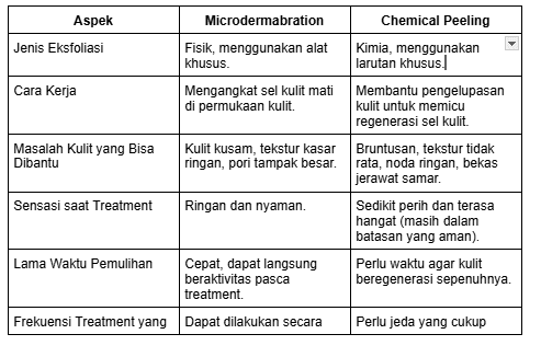 Dari penjelasan di atas, walaupun sama-sama masuk kategori treatment eksfoliasi, microdermabrasion dan chemical peeling punya cara kerja, fokus, dan hasil yang berbeda. Biar nggak makin bingung, kita bahas satu per satu, yuk!